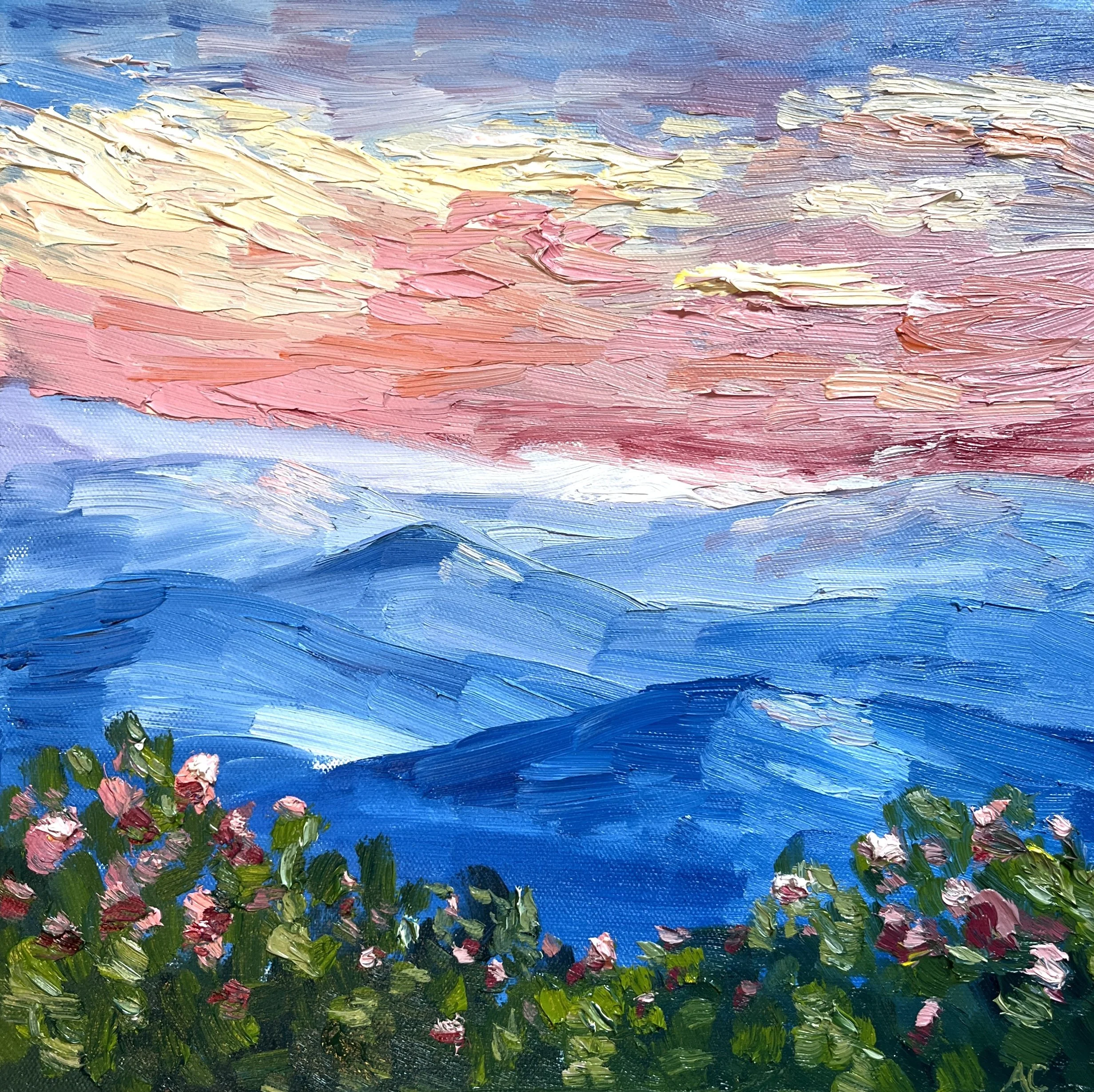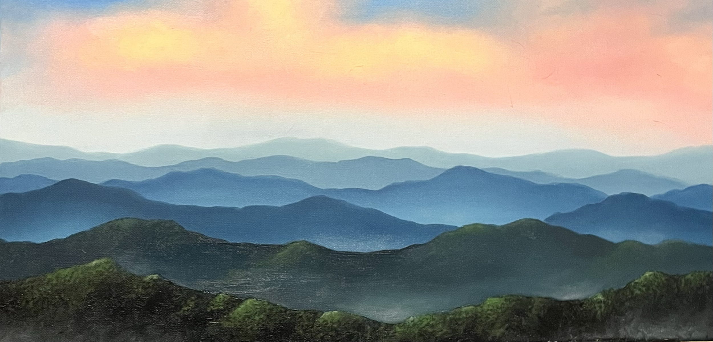 “Sunrise on the Blue Ridge; 15”×30” oil on canvas